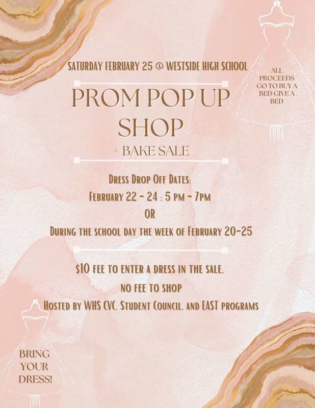 WHS Children's Volunteer Club along with Student Council and EAST will host a Prom Pop Up Shop and Bake Sale on Saturday, February 25, from 10-5. The event will be held in the WHS Library and please enter the building on February 25th at the high school office entrance.